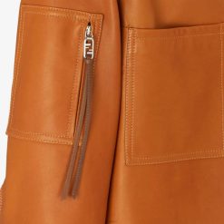 Chaqueta estilo camisero con cuello solapa y manga larga. cuatro bolsillos de parche en la parte delantera. cierre a presión cubierto. Confeccionado en piel plonge color tostado. adornado con un bolsillo con cremallera en la manga derecha. Etiqueta fendi roma en jacquard en el dobladillo. forro estampado.