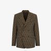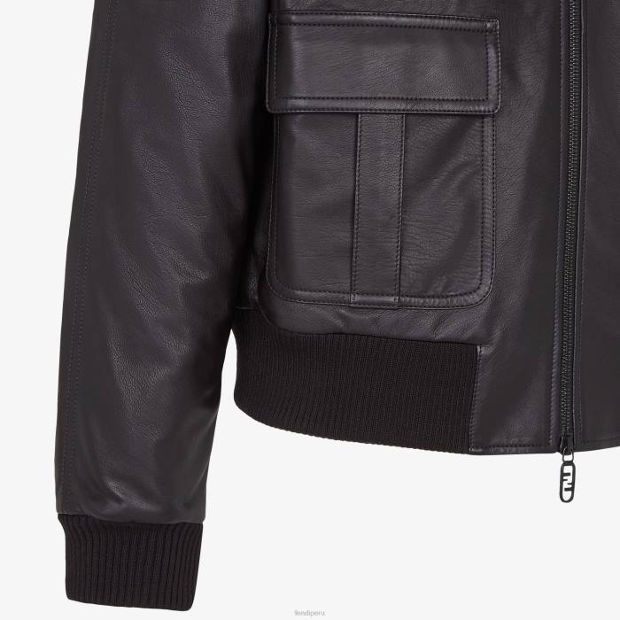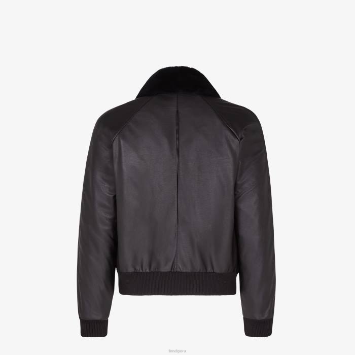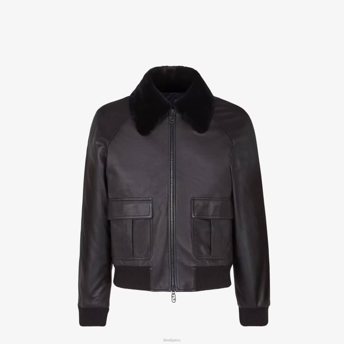 Chaqueta corta de estilo motero, con manga raglán y bolsillos delanteros con solapa. Puños y bordes de punto. Cierre de cremallera con doble cursor. Confeccionado en piel lisa de color negro. adornado con un cuello camisero de piel de oveja negra y un forro acolchado personalizado con motivo fendi o’lock.