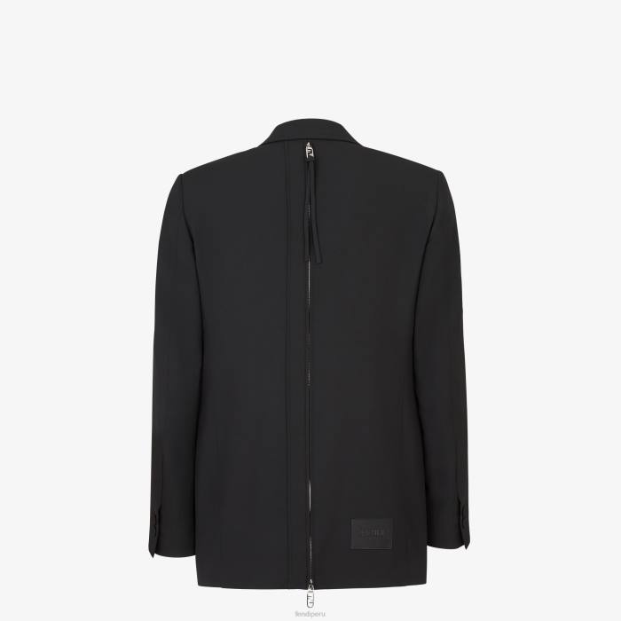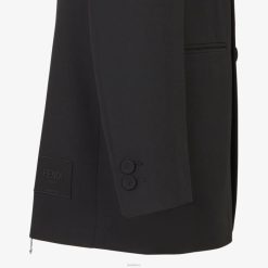 Chaqueta cruzada de corte recto. solapas de pico, bolsillo en el pecho y bolsillos de ribete. Cierre con botones forrados. hecho de lana negra. El modelo presenta una cremallera larga en el centro de la espalda con un deslizador Fendi O’lock y una etiqueta Fendi Roma en jacquard en el dobladillo. forrado.