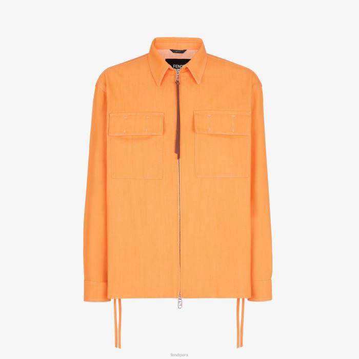 Chaqueta estilo camisa con bolsillos oversize de parche en el pecho. Cierre de cremallera con doble cursor. confeccionado en denim naranja. adornado con un parche fendi roma de jacquard en la parte posterior y una pestaña de cuero en el deslizador fendi o’lock.