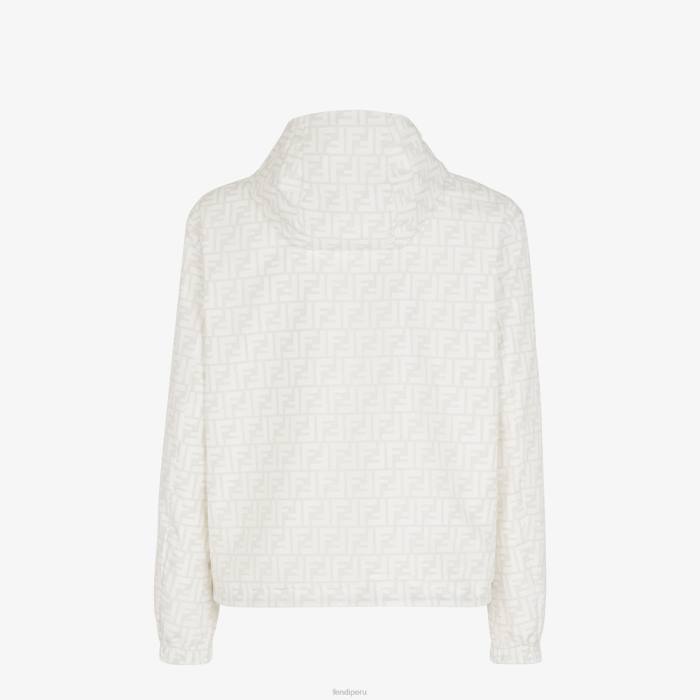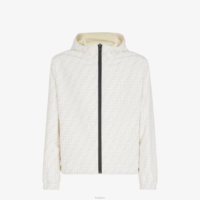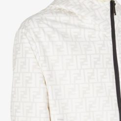 Chaqueta reversible con capucha y bolsillos laterales. El modelo tiene un ajuste relajado con puños y dobladillo inferior elásticos. cierre frontal con cremallera. fabricado en nailon. un lado está personalizado con un motivo ff integral en blanco y el otro en color beige liso con un parche cuadrado de Fendi a juego.