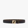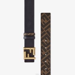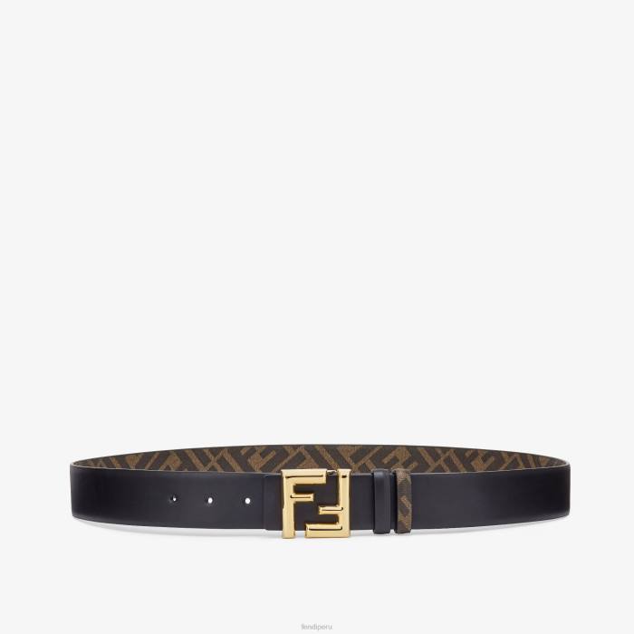 cinturón reversible. hebilla icónica con tachuelas ff. Confeccionado en piel lisa de color negro. reverso de tela con motivo ff marrón y tabaco. artículos de metal con acabado dorado.