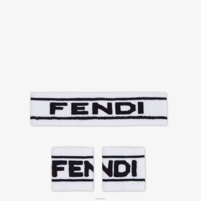 Conjunto de tenis compuesto por diadema elástica y muñequeras. confeccionado en rizo de algodón blanco. personalizado con intarsia de letras fendi negras.