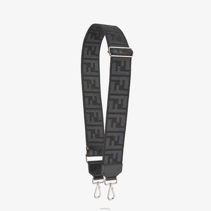 Bandolera larga ajustable con doble clip, para usar en combinación con cualquier bolso con ganchos. Confeccionado en cinta con motivo ff en negro y gris oscuro. adornado con detalles de cuero negro. Artículos metálicos con acabado en paladio.