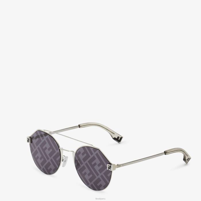 Gafas de sol redondas y ultraligeras fabricadas en metal con acabado paladio. Frente con doble puente y terminales de metal personalizados con motivo ff. patillas esbeltas con puntas de acetato transparente color champán con motivo ff. lentes azules con motivo ff. almohadillas nasales ajustables.