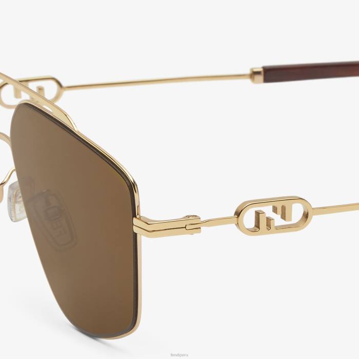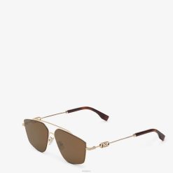Gafas de sol fendi o’lock pilot cuadradas en metal dorado. Doble puente y patillas finas con logo fendi o’lock. almohadillas nasales ajustables y puntas de acetato habano oscuro. lentes marrones.