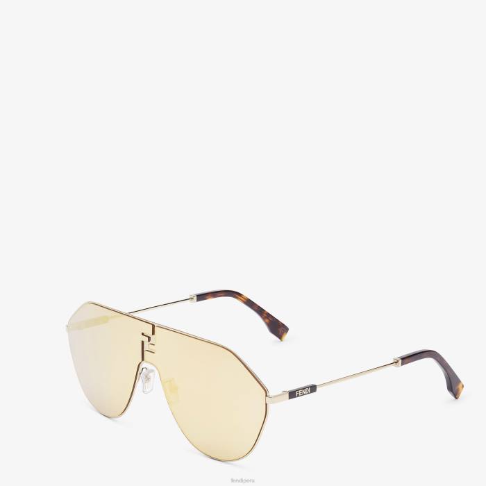 Gafas de sol extragrandes con escudo ff match en metal dorado claro. Logotipo ff recortado en la lente. almohadillas nasales ajustables y puntas de acetato habano oscuro. lentes grises con efecto espejo ultraamarillo.