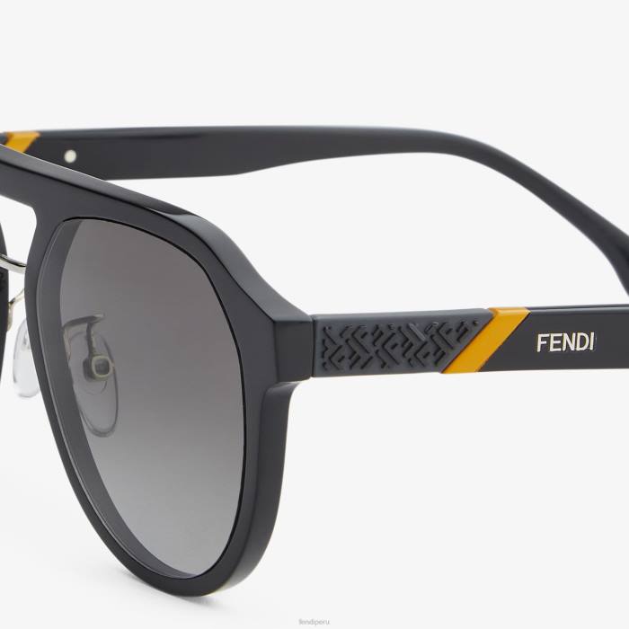 Montura piloto en acetato negro. Doble puente con detalle en metal color paladio. patillas con inserción de goma gris y patrón ff en relieve con un detalle de metal amarillo. Lentes degradadas de color gris oscuro y plaquetas nasales ajustables personalizadas con el logotipo de Fendi.
