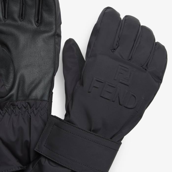 Guantes de esquí con puños de punto y correa ajustable. Confeccionado en tejido técnico negro. personalizado con inscripción ff fendi en relieve en la parte posterior.