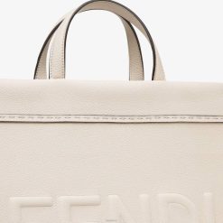 Bolso shopper mediano confeccionado en piel plena flor color beige claro, con logo fendi roma con efecto 3D. Pespuntes cosidos a mano tono sobre tono y lazo anudado en el lateral.