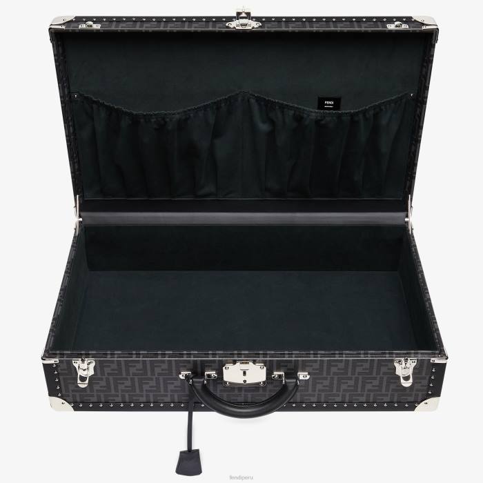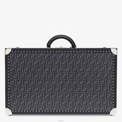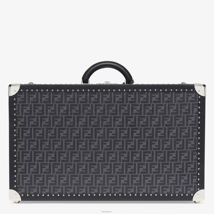 Baúl de viaje rectangular en versión grande con doble cierre a presión y candado. Asa única con etiqueta para llavero y correa para el hombro ajustable y desmontable. Gran compartimento interior con dos bolsillos para periódicos. Confección en tela con motivo ff en negro y gris. Detalles de cuero negro. Artículos metálicos con acabado en paladio.