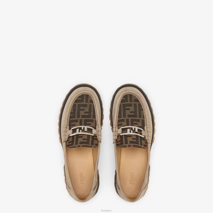 Mocasines con delantal cosido visible y parte superior decorada con detalle fendi o’lock. Confeccionado en piel nobuck beige. Delantal zapato en tejido jacquard ff marrón y tabaco. Accesorios de metal con acabado paladio. suela de goma grabada.
