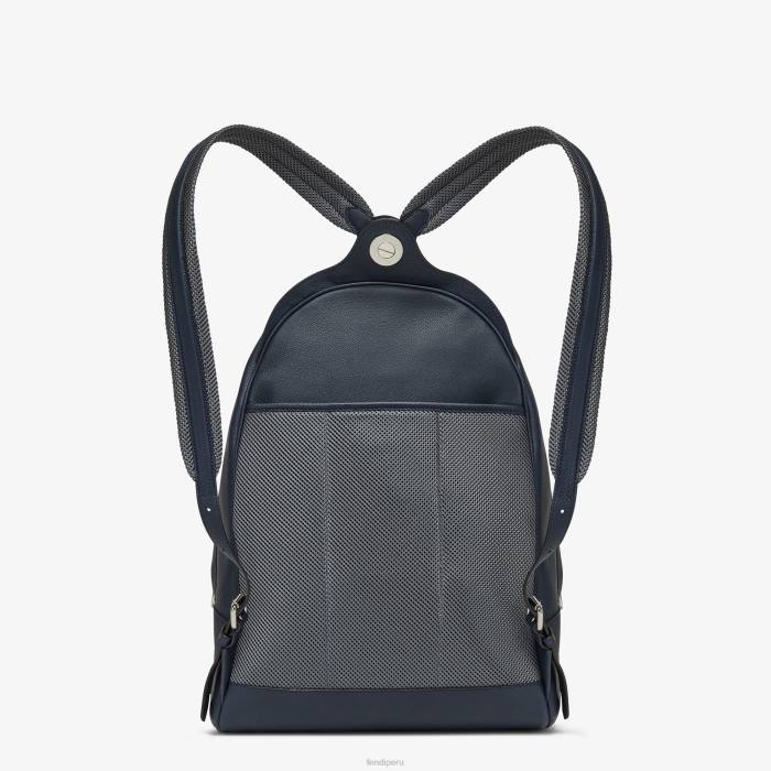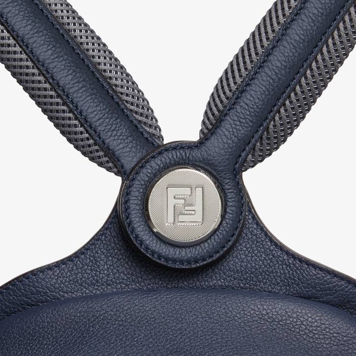 Mochila espaciosa y estructurada. El diseño presenta un remache de metal con el logo ff grabado que une los tirantes y permite usarlo como un solo hombro. Confeccionado en piel flor azul oscuro. acabado con bolsillo frontal con cremallera.