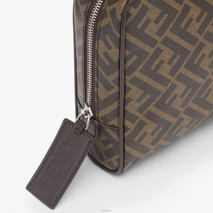 Neceser con cierre de cremallera y bolsillos internos. Confección en tela con motivo ff en color marrón y tabaco. adornado con detalles de cuero marrón y tirador de cremallera de cuero con letras fendi roma. Forro de tela lavable. Artículos metálicos con acabado en paladio.