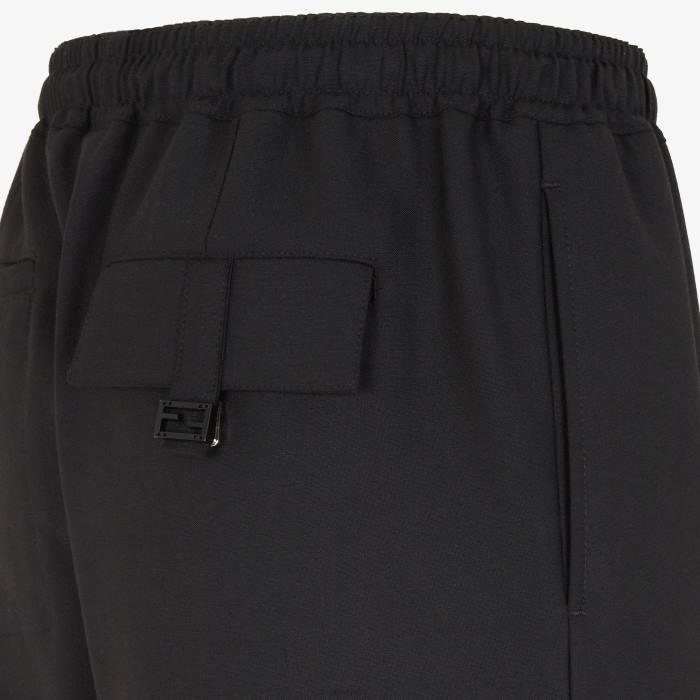 Pantalón jogger con cinturilla elástica con cordón. Raya del pantalón cosida e inserciones elásticas con cremalleras laterales en los tobillos. Confeccionado en tejido de lana elástica de color negro. adornado con una pequeña etiqueta Fendi de cuero negro aplicada en la cintura.