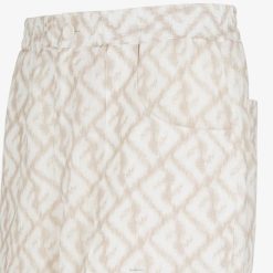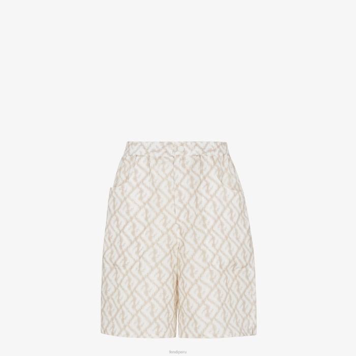 Bermudas con cinturilla elástica y pliegues en la parte delantera. bolsillos laterales y bolsillos de parche en la espalda. Cierre oculto con botón y cremallera. Confección en lino con motivo ff diagonal efecto ikat estampado íntegramente en blanco y beige.