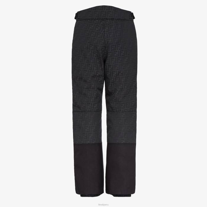 Pantalón de esquí de cintura alta con tirantes laterales ajustables y bolsillos con cremallera en los laterales. Cremallera oculta y cierre a presión. Confección en tejido técnico impermeable y cortavientos en color negro con motivo ff a juego. acabado con inserciones de color liso y detalles reforzados en la rodilla. Tirante ff con clip en la cintura.