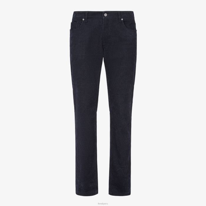 Pantalón ajustado de 5 bolsillos. adornado con remaches y botones de la marca. Confeccionado en denim de terciopelo azul oscuro. Marca con microestampado ff tono sobre tono en toda la prenda.