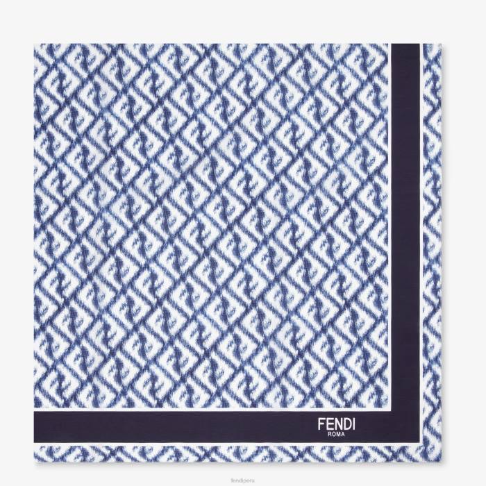 Pareo rectangular confeccionado en algodón y seda con motivo ff diagonal efecto ikat estampado íntegramente en blanco y azul. Borde de color liso y logotipo de Fendi Roma del mismo color.