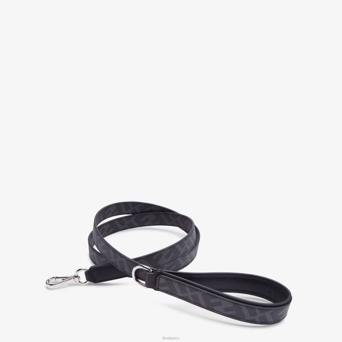 Correa para perros con anilla y clip personalizada con inscripción Fendi. Confección en tela con motivo ff en negro y gris. Detalles de cuero negro. Artículos metálicos con acabado en paladio.