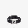 pulsera de eslabones cerrada con un pequeño clip. fabricado en metal con acabado paladio. decorado con detalles de baguette ff esmaltados en blanco y una placa esmaltada en blanco con letras fendi roma en negro.