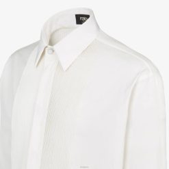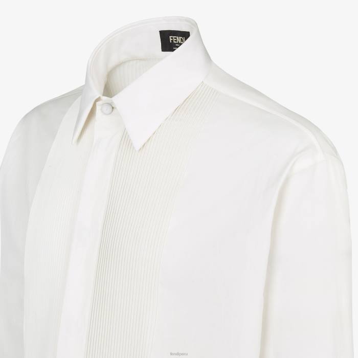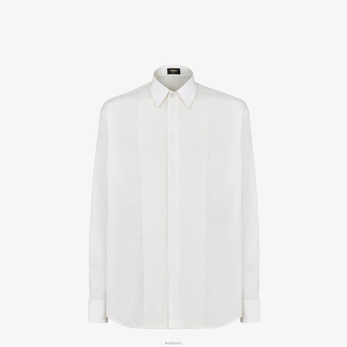Camisa regular fit con cuello estilo italiano. cierre de botones. hecho de algodón blanco. adornado con motivo plisado bordado en la parte delantera con efecto tapeta.