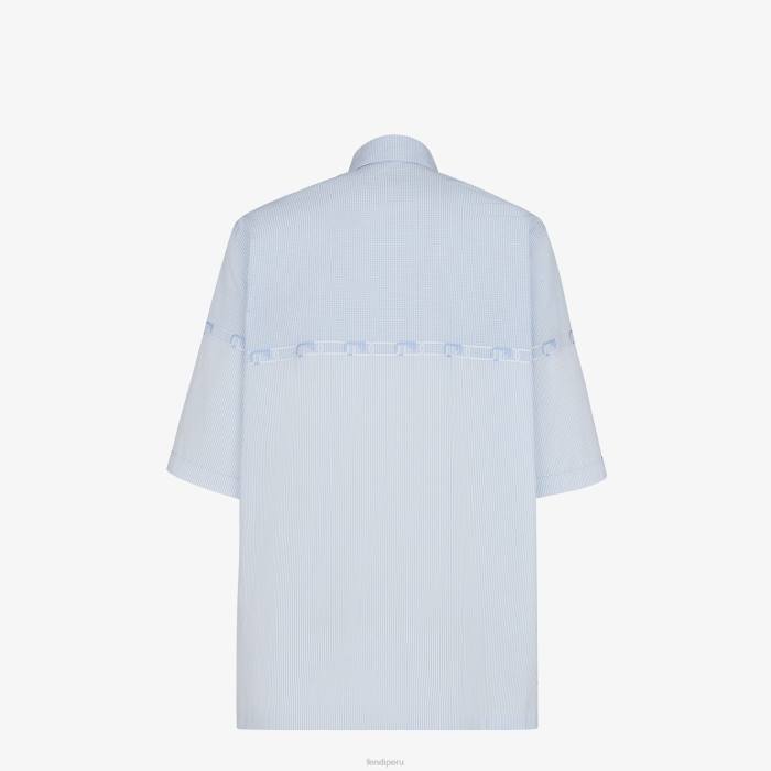 Camisa oversize con cuello estilo italiano y manga corta. Cierre con botones ocultos. Confeccionado en algodón con estampado micro vichy en color azul claro. personalizado con el motivo fendi o’lock bordado en color a juego en el canesú y las mangas.