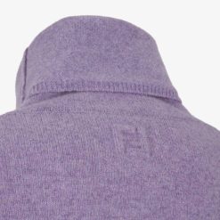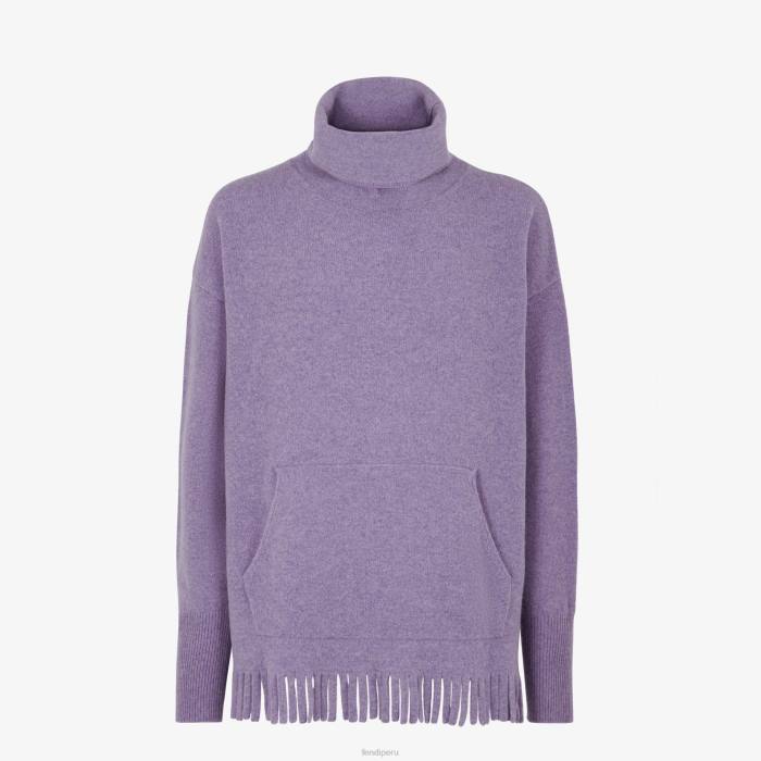 Jersey de cuello alto, bolsillo canguro delantero y manga larga caída. Corte regular, rematado con bordes de flecos. puños anchos acanalados. hecho de hilo de lana color lila.