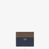 Tarjetero de piel azul con motivo ff. Detalles de cuero beige. Letras fendi roma de metal paladio.