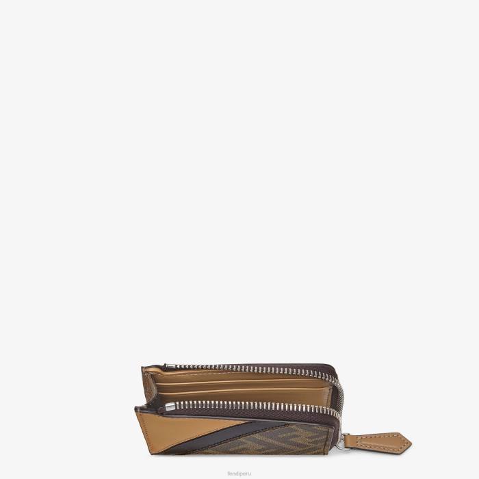 Tarjetero con dos cremalleras laterales. Confección en tejido texturizado con motivo ff en color marrón y tabaco. Adornado con aplicación de piel beige y detalle de incrustaciones en negro. Artículos metálicos con acabado en paladio.