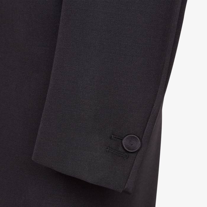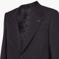 Traje compuesto por chaqueta de botonadura sencilla y entallada y pantalón con raya. hecho de lana negra. acabado con detalles de seda tono sobre tono.