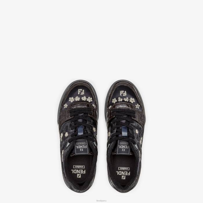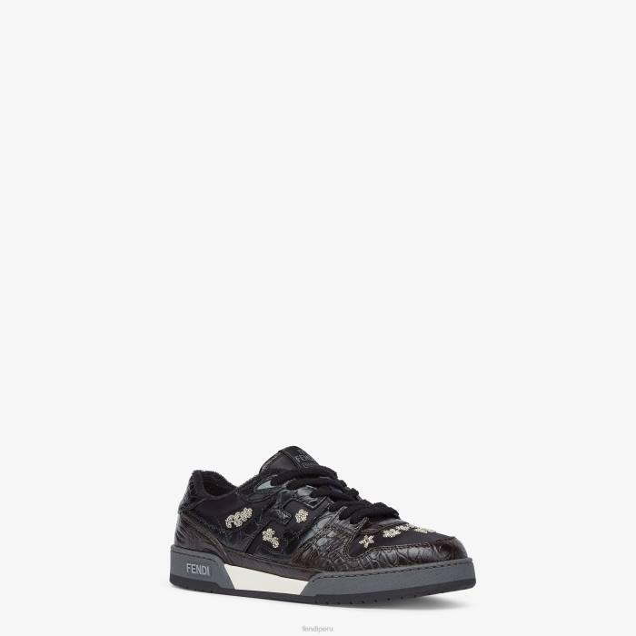 zapatillas fendi match con cordones. Confeccionado en caimán marrón oscuro con detalles en nailon negro. adornado con bordado de cuentas. suela de goma con inscripción fendi en el lateral.