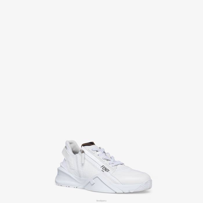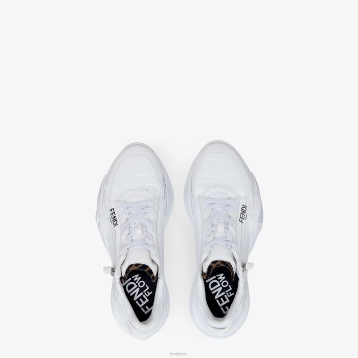 Zapatillas slip-on con cordones elásticos ajustables, cremallera lateral y suela ondulada con f grabada. Letras Fendi Flow grabadas en los talones. Realizado en piel de caimán blanco. adornado con una lengüeta de lycra con motivo ff. suela de goma ligera de color blanco con detalle de f diagonal negra.