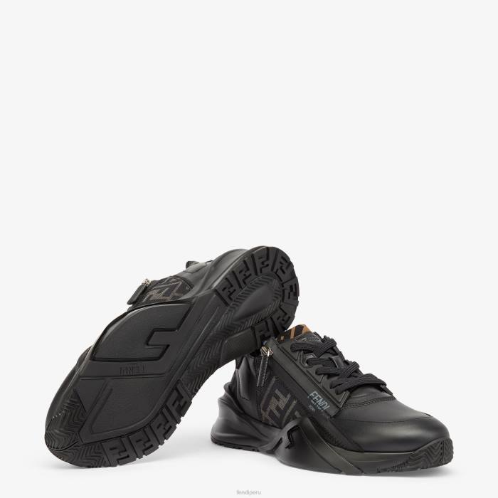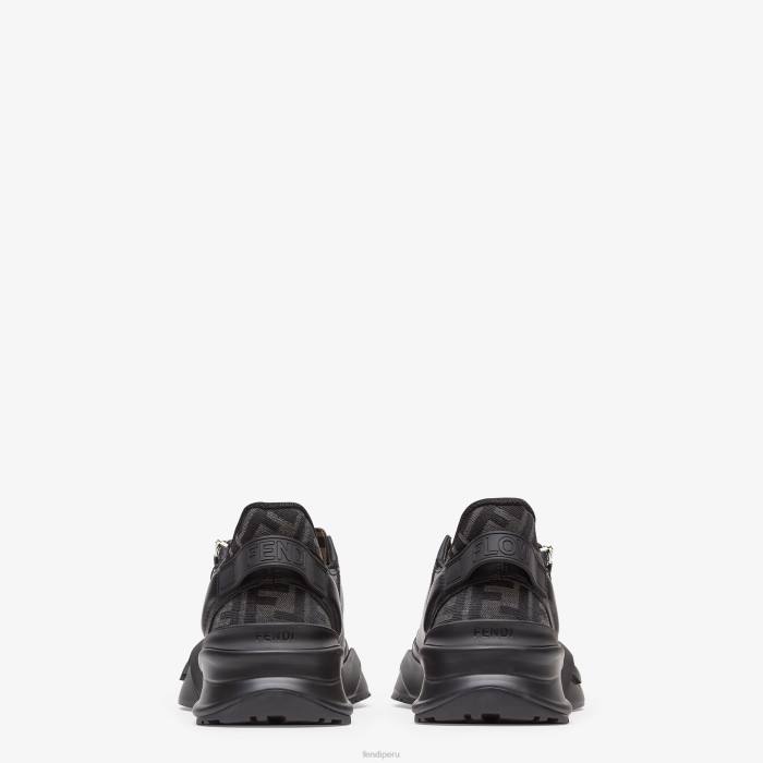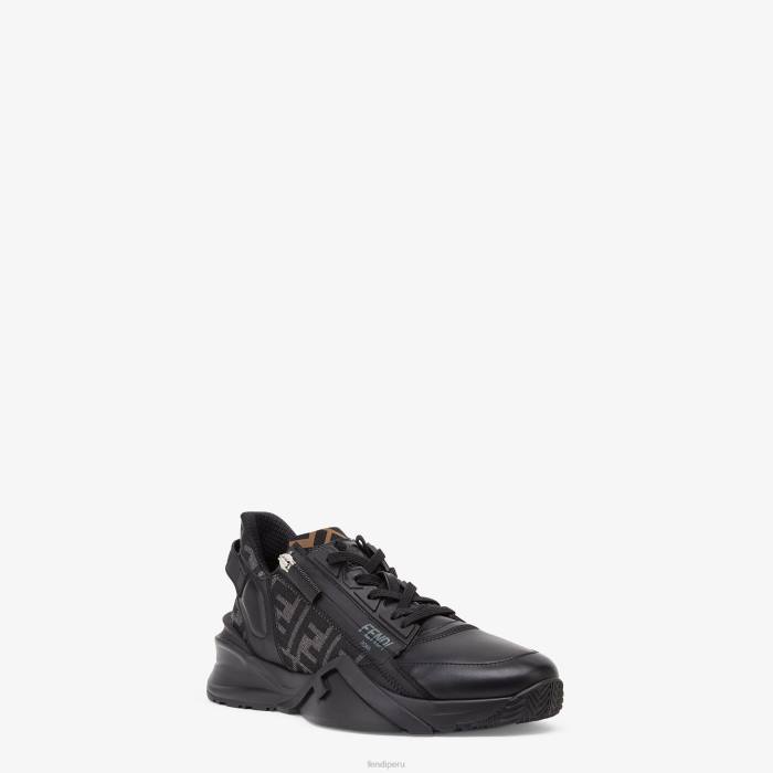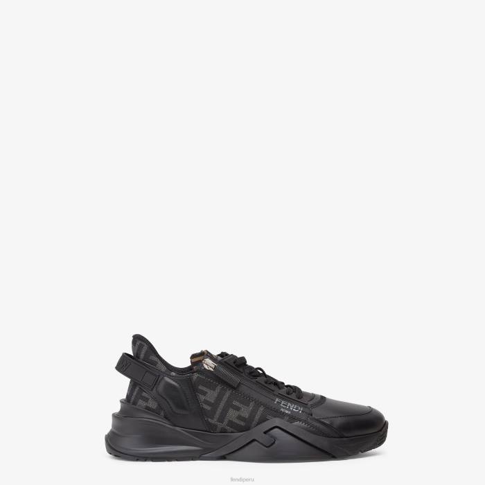 Zapatillas sin cordones con cordones elásticos, cremallera lateral y suela ondulada con f grabada. Letras Fendi Flow grabadas en los talones. Confección en piel negra e inserciones de tejido ff en negro y gris. adornado con detalles de lycra con motivo ff. Suelas ligeras de goma negra con detalle de f diagonal a juego.