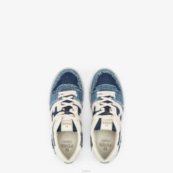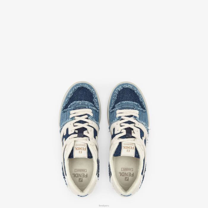 zapatillas fendi match con cordones. Confeccionado en denim azul oscuro, azul claro y blanco. adornado con bordes deshilachados a mano. suela de goma con inscripción fendi en el lateral.