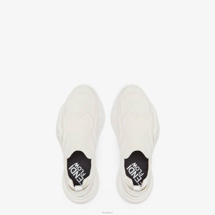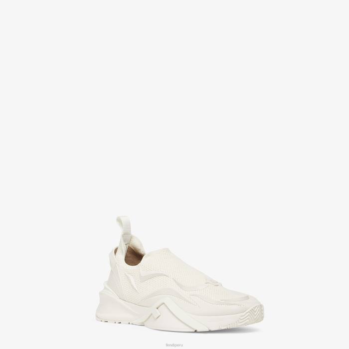 Zapatilla sin cordones con suela ondulada con f grabada. Letras Fendi Flow grabadas en los talones. Confeccionado en malla jacquard color hueso. Detalles en goma tono sobre tono adornados con innovadoras técnicas artesanales.