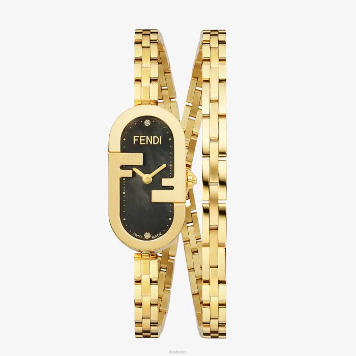 Caja ovalada de acero inoxidable de color dorado de 14,80 x 28,30 mm, con bisel en forma de o’lock de Fendi. corona engastada con un diamante, alrededor de 0,02 quilates. Esfera de nácar negro con efecto rayo de sol, índices engastados con diamantes a las 12 y a las 6, con un total de aproximadamente 0,01 quilates, agujas de minutos y segundos con talla radial de color dorado. Brazalete de doble vuelta de acero inoxidable, 5,95 mm, con eslabones brillantes y satinados en contraste y hebilla desplegable.