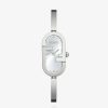 Color dorado brillante, satinado, 14,80 x 28,30 mm, caja ovalada de acero inoxidable, bisel Fendi O’lock con 33 diamantes insertados en dos tamaños diferentes, con un total aproximado de 0,10 quilates. corona engastada con un diamante, alrededor de 0,02 quilates. Esfera dorada con efecto rayo de sol, indicadores con diamantes incrustados a las 12 y a las 6, con un peso total de aproximadamente 0,01 quilates, agujas de minutos y segundos de color dorado con talla radial. Correa rígida de acero inoxidable color dorado, 3,50 mm, con hebilla desplegable.