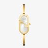 Caja ovalada de acero inoxidable, satinada, de color plateado brillante, de 14,80 x 28,30 mm, con bisel Fendi O’lock con 33 diamantes insertados en dos tamaños diferentes, con un peso total de aproximadamente 0,10 quilates. corona engastada con un diamante, alrededor de 0,02 quilates. Esfera plateada con efecto rayo de sol, indicadores con diamantes incrustados a las 12 y a las 6 horas, con un peso total de aproximadamente 0,01 quilates, agujas de minutos y segundos plateadas con talla radial. Brazalete de acero inoxidable color plata, 3,50 mm, con hebilla desplegable.