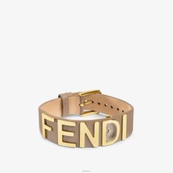 Caja de acero inoxidable con forma de letra D con revestimiento de PVD dorado brillante. Corona con logo ff grabado. Esfera brillante de color gris tórtola, índices y agujas talladas en radio con revestimiento de PVD dorado. Pulsera de piel gris tórtola, 16 mm, con inscripción Fendi y hebilla con revestimiento de PVD dorado.