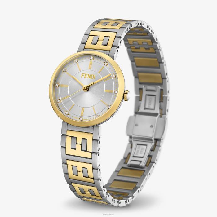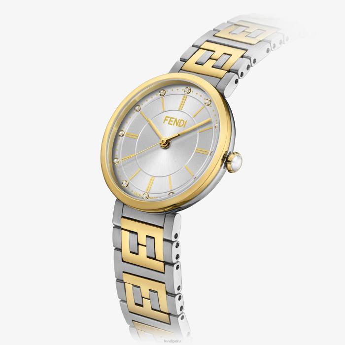 caja de acero inoxidable pulido y cepillado, bisel y corona de acero inoxidable de color oro amarillo, corona engastada con una piedra de ónix blanco. Esfera plateada con rayos de sol, índices y agujas de color oro amarillo. Brazalete de acero inoxidable satinado con eslabones centrales pulidos en color oro amarillo con logo ff y hebilla desplegable.