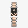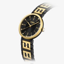 Caja de acero inoxidable negro pulido y cepillado, bisel y corona de acero inoxidable de color oro amarillo, corona engastada con una piedra de ónix blanco. Esfera lacada en negro engastada con 12 diamantes de aproximadamente 0,06 quilates y agujas de color oro amarillo. Brazalete de acero inoxidable con acabado satinado negro con eslabones centrales pulidos en color oro amarillo con logo ff y hebilla desplegable.