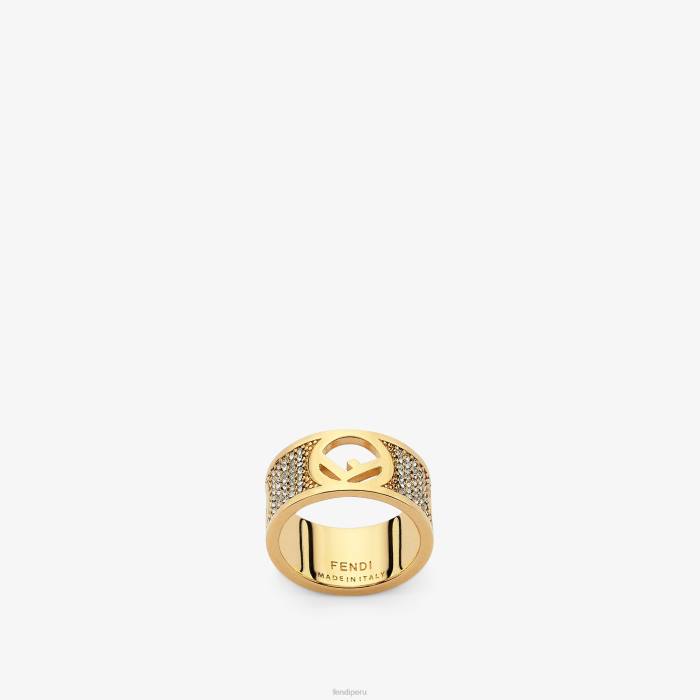 Anillo ancho con motivo f is fendi. fabricado en metal con acabado dorado. adornado con pequeños cristales blancos.
