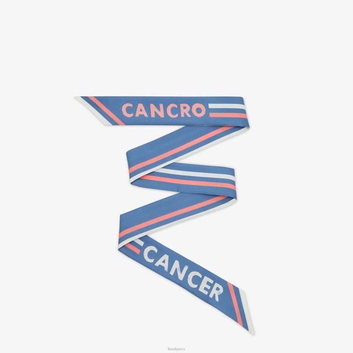 envoltura de dos caras. Se puede llevar alrededor del cuello, anudado en la muñeca o como complemento de un bolso con un toque de color. confeccionado en seda azul con letras cancro/cancer impresas en blanco y rosa. acabado con detalles de rayas en los mismos colores.