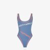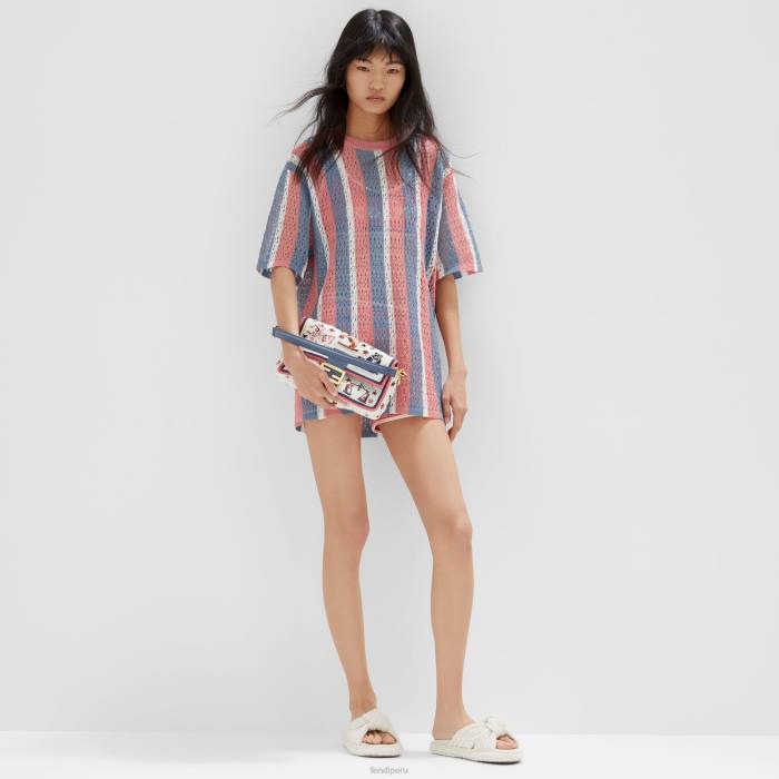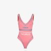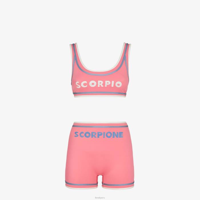 Bañador compuesto por top y shorts ajustados. Confeccionado en lycra rosa con estampado de letras fendi astrology en contraste. adornado con doble ribete en los bordes en azul claro y blanco. bolso a juego con cordón y logo de fendi roma.