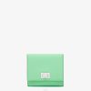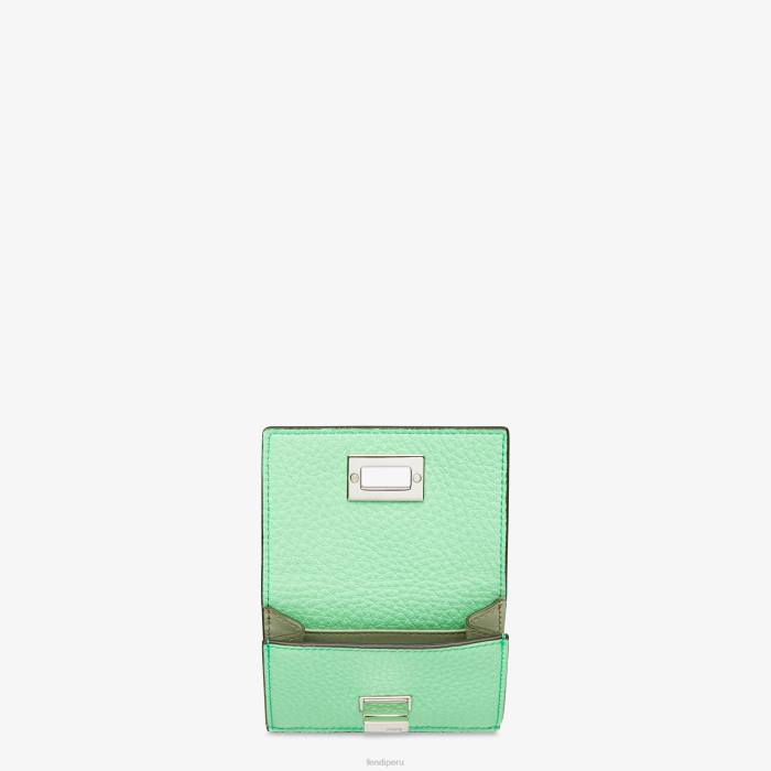 Cartera peekaboo compacta de tres pliegues con gran compartimento interno para billetes y tres tarjeteros ocultos. Monedero externo con icónico cierre giratorio. Confección en piel cuoio romano verde. Forro de piel verde claro. Artículos metálicos con acabado en paladio.