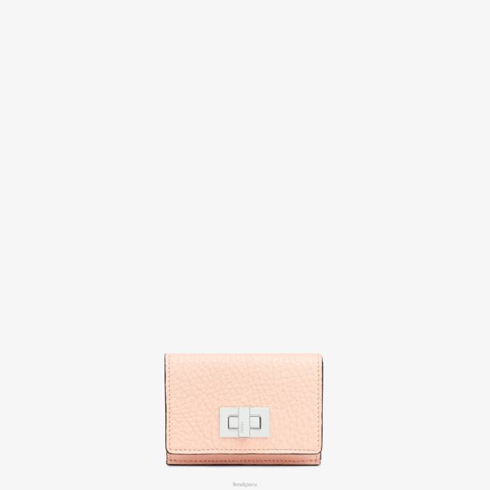 Cartera peekaboo compacta de tres pliegues con gran compartimento interno para billetes y tres tarjeteros ocultos. Monedero externo con icónico cierre giratorio. Confección en piel cuoio romano rosa. Artículos metálicos con acabado en paladio.