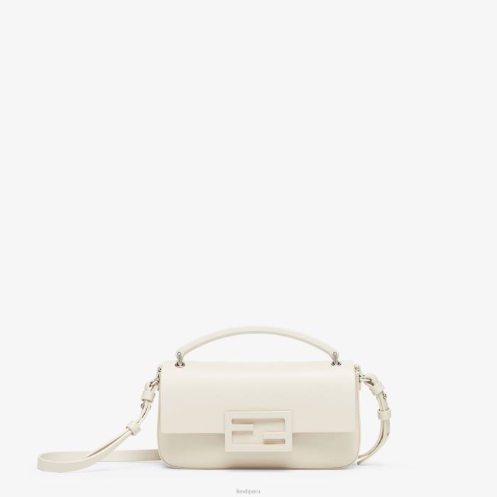 Funda para smartphone baguette con solapa frontal y cierre con botón magnético ff. Asa pequeña rígida y bandolera desmontable. Confeccionado en charol blanco con efecto brillo matizado. Motivo ff esmaltado tono sobre tono. Artículos metálicos con acabado en paladio.