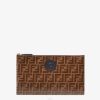 Bolsa delgada ffreedom con cierre de cremallera. el interior tiene seis ranuras para tarjetas. Confección en tejido vidriado con motivo jacquard ff. Personalizado con parche de sello Fendi en piel. artículos de metal con acabado dorado.