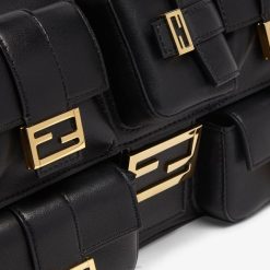 Bolso baguette multibolsillos confeccionado en suave napa negra, con cinco bolsillos aplicados de diferentes tamaños. los bolsillos y la solapa delantera están decorados con el icónico cierre ff.